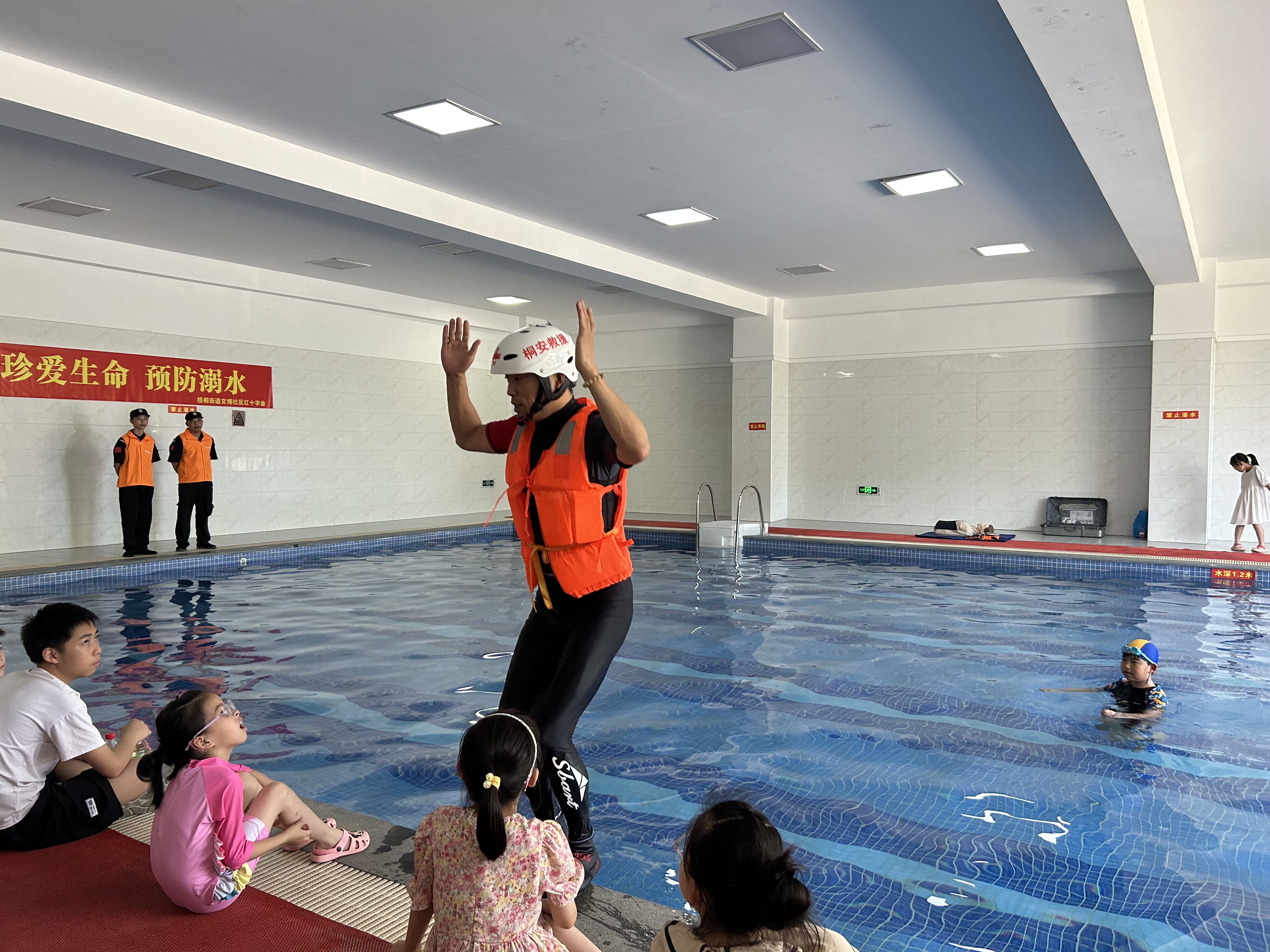 “落水后,要迅速调整姿势成仰泳式,尽可能把口鼻伸出水面......如遇同伴落水,千万不能下水施救,要大声叫周围的大人来帮忙,及时拨打110、119等电话求助,在保证自身安全的情况下,利用衣服、水桶、抛绳、竹竿等物品实施救援……”在实景操作环节,张剑老师在泳池中以情景模拟人员溺水和生动的肢体语言为大家讲解溺水的特征、水中自救、岸上救援和“一圈一杆一绳”使用的正确方法,让大家掌握正确的防溺水技能,让更多的人了解身边的救命设备。