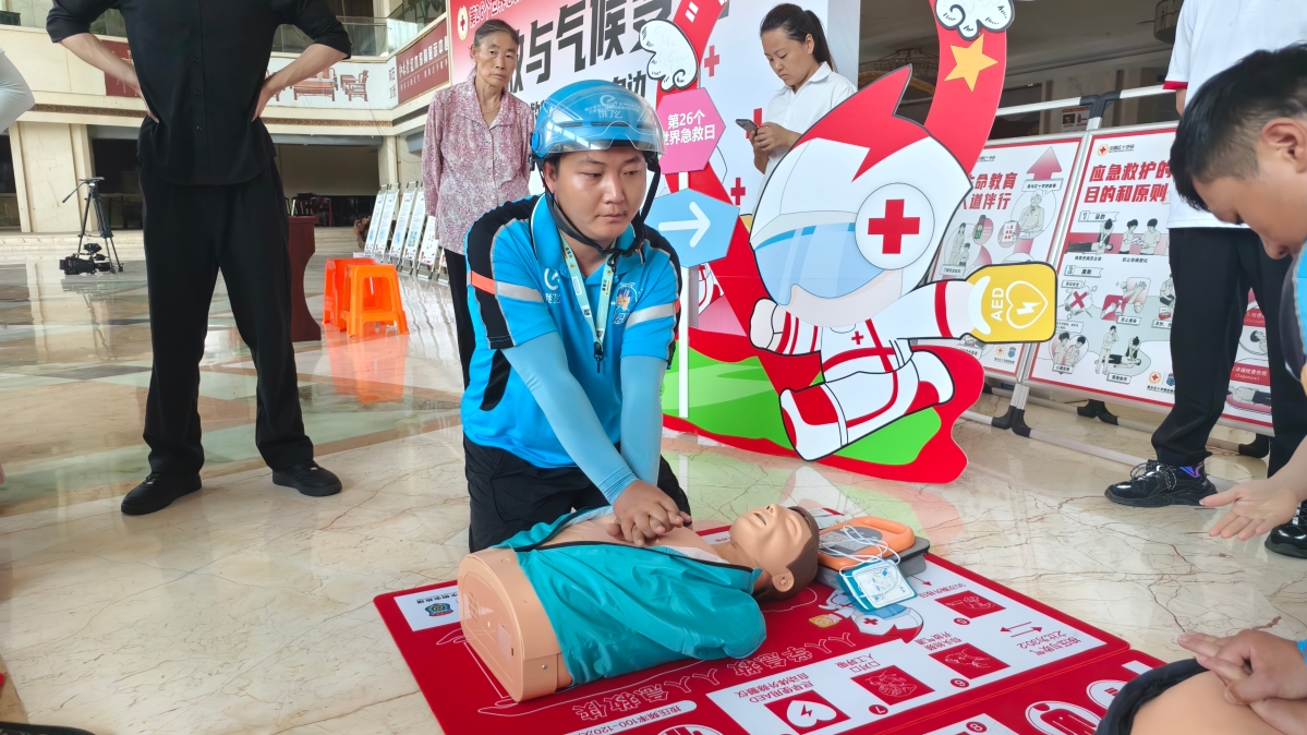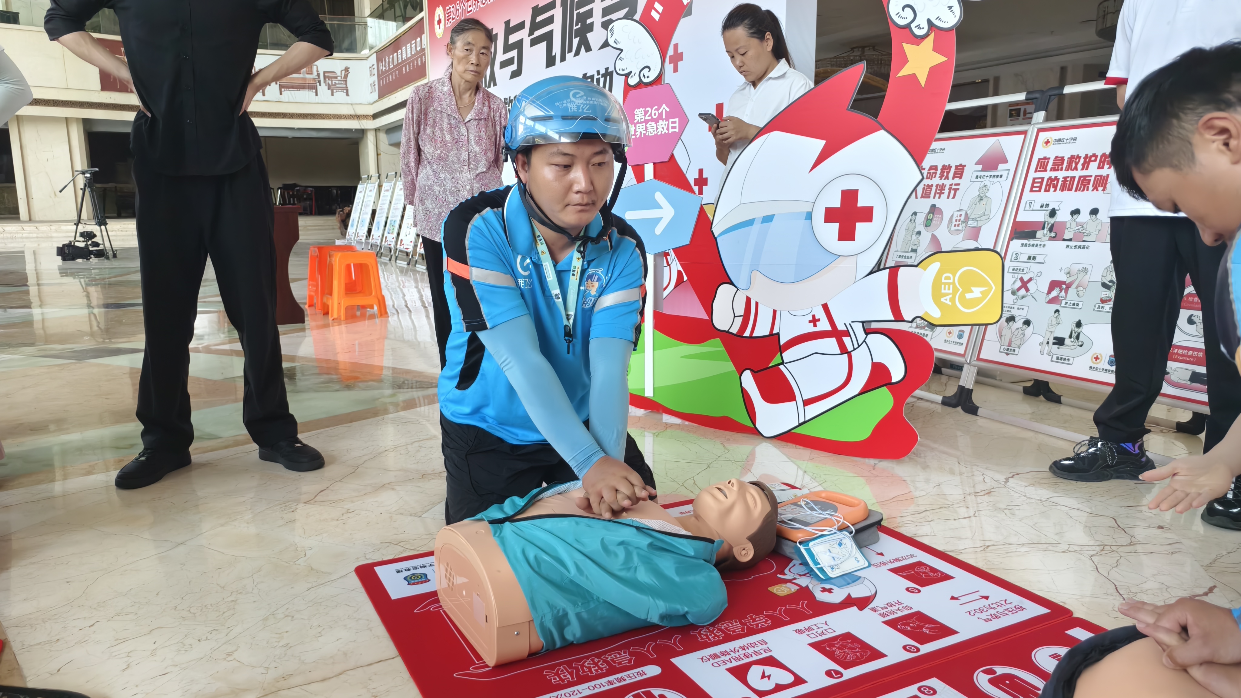 “现在,我来教大家怎么进行心肺复苏和人工呼吸。”活动现场,红十字应急救护师详细演示心肺复苏、人工呼吸和AED的正确使用方法。